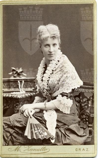 La donna è ritratta seduta con un ventaglio in mano