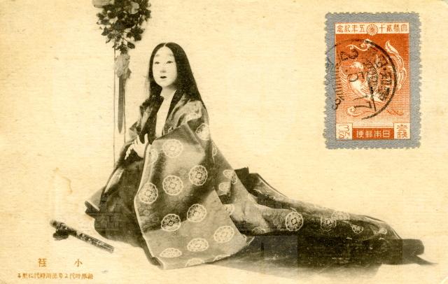 La cartolina è stata affrancata sul recto con annullo "di favore", il collezionista-filatelico evidentemente non voleva farsi mancare nulla e in questo modo ci ha reso un servizio permettendoci di datare la cartolina. Il bel francobollo color bronzo col disegno dell'araba fenice venne emesso il 10 maggio 1925 per commemorare il venticinquesimo anniversario di matrimonio, le "nozze d'argento", dell'imperatore Yoshihito e l'imperatrice Sadako. L'annullo riporta la data alla maniera giapponese: anno-mese-giorno, 2-5-17, dove l'anno viene computato secondo il periodo di regno dell'imperatore Showa, in questo caso il suo secondo anno, cioè il 1927.Il nome e l'indirizzo che appaiono stampati nell'area destinata al messaggio, sul verso, sono probabilmente quelli della società cha ha utilizzato la cartolina come veicolo pubblicitario. Non è stata prodotta per il mercato internazionale, vista la mancanza di didascalie in inglese; la scritta sul bordo sinistro del verso, forse il nome dell'editore o dello stampatore, è in caratteri kanji. L'immagine è la raffigurazione di una dama di corte del primo periodo Heian, il periodo Fujiwara (858-1160), una delle fasi culturalmente e artisticamente più importanti del Giappone, in cui vissero delle aristocratiche dame di corte (nyobo), autrici di celebri opere - anche nel genere dello zuihitsu, simile al diario - che costituiscono alcune delle più fulgide gemme del firmamento letterario dell'epoca. Sono Murasaki Shikibu (ca. 973-1014) autrice del capolavoro Genji Monogatari (La storia di Genji), Sei Shonogan (965-dopo il 1010) del Makura no Soshi (Note del guanciale), Izumi Shikibu (ca. 976-ca. 1033) del Izumi Shikibu nikki (Diario di Izumi Shikibu), Akazome Emon (ca. 956-1041) del Eiga Monogatari (Storia di splendori). Le loro opere ci offrono la possibilità di conoscere la condizione delle donne di corte dell'epoca e la loro visione della vita e dell'amore. La giovane donna della cartolina è abbigliata e acconciata secondo la moda del tempo, indossa lo junihitoe, un suntuoso abito indossato solo dalle dame di corte, formato da 12 vesti di seta e dal peso di circa 20 chili; i lunghissimi capelli, lunghi più della propria statura, di un nero corvino dai riflessi blu, sono sciolti sulle spalle; le sopracciglia sono rasate e poi tratteggiate, spesse e sfumate, un po' più in alto sulla fronte; tra le mani ha uno shakuhachi, il flauto dritto di bambù tipico della musica tradizionale giapponese.