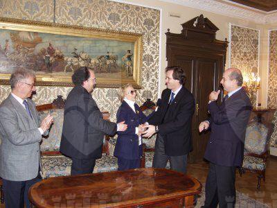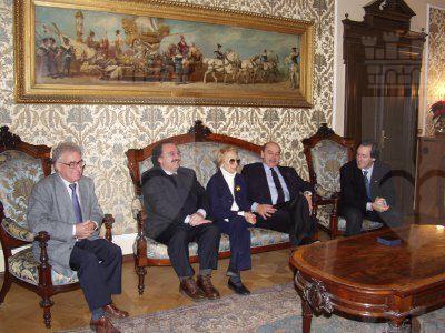 Il sindaco Roberto Dipiazza con il presidente del consiglio comunale Bruno Sulli ed l'assessore comunale Roberto Menia, durante l'incontro con la signora Fulvia Costantinides e suo figlio Fulvio, nel salotto azzurro del Municipio.