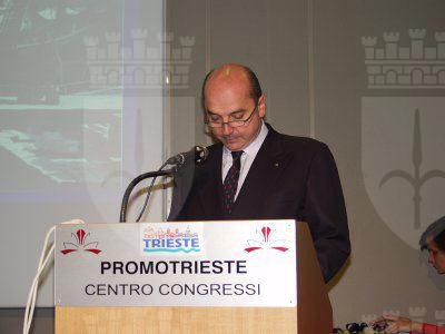Il sindaco Roberto Dipiazza consegna il sigillo trecentesco al professor Umberto Senin, al tavolo della presidenza siedono l'assessore regionale alla sanità Gianni Pecol Cominotto e il professor Luciano Campanacci presidente dell'Associazione Medica Triestina