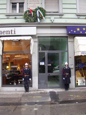 L'assessore Fulvio Sluga ed il consigliere Silvano Magnelli commemorano con corone d'alloro le targhe ai Caduti del '53, ai Caduti del 5 maggio '53, la targa Beltramini '45, le targhe ai Caduti antinazisti del '44 ed ai 41 martiri antifascisti del '44