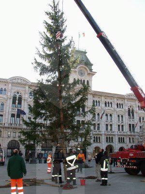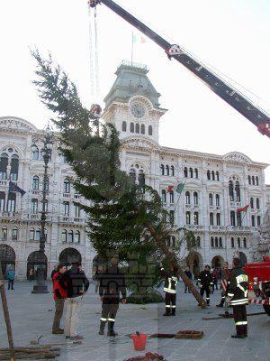 Operazioni per la posa dell'albero di Natale in piazza Unità d'Italia.