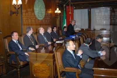 Il sindaco Roberto Dipiazza ed il Presidente del Consiglio comunale Bruno Sulli ed l'assessore comunale Maurizio Bucci con il presidente di Round Table Italia Maurizio Giudici e gli altri rappresentanti presenti al Meeting organizzato dalla Round Table Italiana in collaborazione con il Comune di Trieste, durante l'incontro avvenuto nella sala del Consiglio del Municipio.