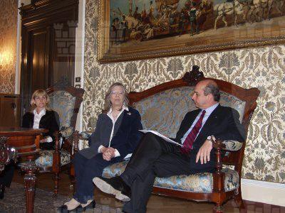 Roberto Dipiazza sindaco e Silvana Alessio presidente della FIDAPA presentano il riconoscimento che verrà attribuito dalla FIDAPA a Fulvia Costantinides : Trieste : 2002