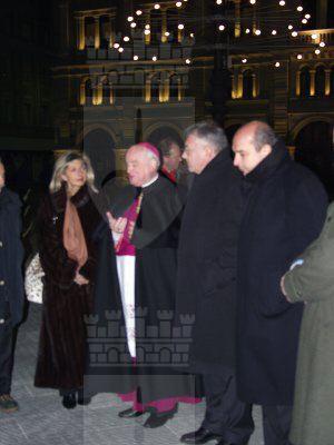 Eugenio Ravignani, il sindaco Roberto Dipiazza e Giorgio Rossi davanti al presepe di piazza Unità d'Italia
