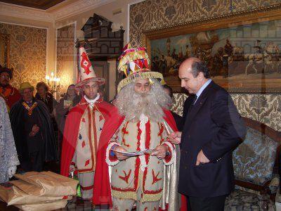 Il sindaco Roberto Dipiazza, l'assessore Maurizio Bucci e Roberto De Gioia presidente del Comitato «Trieste in Palio» incontrano il gruppo di maschere