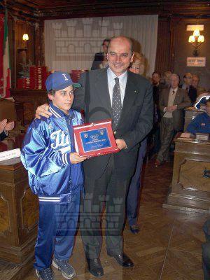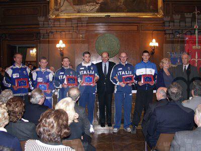 Nella sala del Consiglio Comunale il sindaco Roberto Dipiazza consegna il premio ad un giovane atleta azzurro, i giocatori nazionali di pallamano di Trieste, Irene Camber e Nino Benvenuti