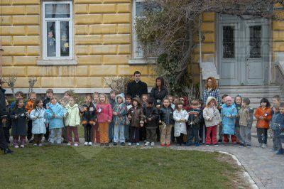 Angela Brandi e padre Paolo Rakic assieme ai bambini della scuola ed all'alberello di ulivo