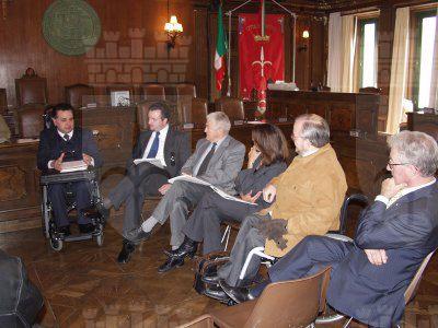 L'assessore comunale Claudia D'Ambrosio, il presidente del Consiglio comunale Bruno Sulli ed il Vicepresidente del Consiglio regionale del FVG Giulio Staffieri, durante l'incontro con il presidente Giuseppe Trieste ed altri rappresentanti del Fondo Italiano Abbattimento Barriere Architettoniche ,