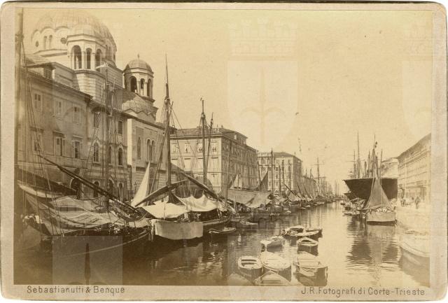 Il Canale di Ponterosso o Canal Grande, con numerosi velieri, bragozzi e barche, visto dalla chiesa di S. Antonio Nuovo. A sinistra la vecchia casa del caffe' Stella Polare, gia' Vukasovich, prima delle modifiche del 1902-1904; poi il piccolo palazzo sede della scuola serba Jovan Miletic e la Chiesa di San Spiridione della comunita' serbo-ortodossa, costruite ambedue dall'arch. milanese Maciacchini, terminate nel 1868. Segue la casa Brunner e la casa Genel, eretta nel 1873 dall'arch. Antonio Bacicchi e radicalmente modificata nell'interno nel 1928 per ospitarvi una filiale della Banca Commerciale Italiana. L'ultima costruzione e' il lungo fianco del neoclassico Palazzo Carciotti (arch. M. Pertsch, 1802-1805). Sul fondo del canale si vede il ponte "rosso", toponimo che e' passato ad indicare tutta la zona. Si noti come in origine il canale s'addentrasse in profondità fino alla chiesa di S. Antonio Nuovo, solo nel 1934 il tratto antistante la chiesa, fino alla linea delle vie S. Spiridione e Fabio Filzi, venne interrato