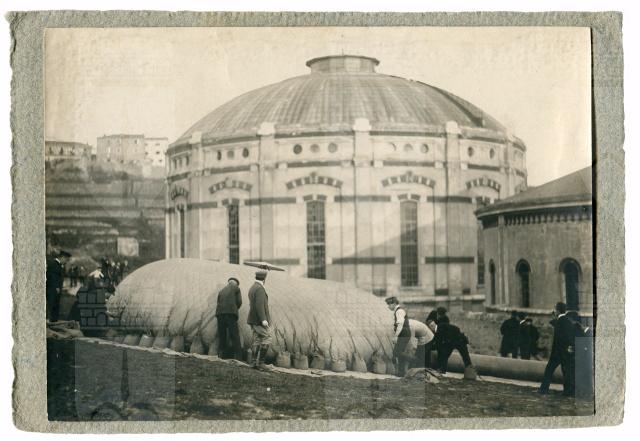 Attraverso la stampa locale viene annunciata l'ascensione in pallone libero del signor Otto Pollack (1876-1971), in via del Broletto n. 244, vicino all'officina comunale del gas, per il giorno 3 aprile 1910. Il ricavato dei biglietti venduti, si specifica, sarà devoluto alla Società amici dell'infanzia. Il pallone aerostatico, è un tipo di aeromobile che si solleva da terra grazie al principio di Archimede, secondo il quale tende a salire nell'atmosfera in quanto gonfiato con gas più leggero dell'aria che lo circonda. Privo di strumenti di manovra si sposta muovendosi con il vento. Il fotografo triestino Biagio Padovan documenta nell'immagine la fase preparatoria di questa pionieristica esperienza di volo.