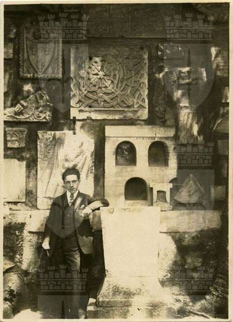 Oscar de Incontrera all'Orto Lapidario del Museo di Storia ed Arte di Trieste. Lo storico è davanti alla parete dei reperti medievali.