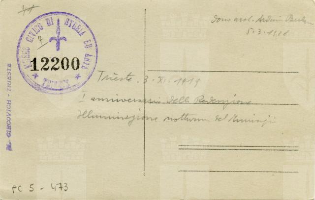 Illuminazione notturna del palazzo del Municipio in occasione del I anniversario della redenzione di Trieste.