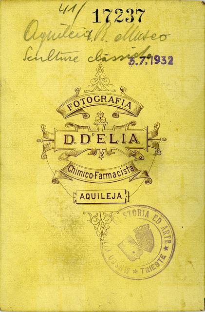 In primo piano vi è il volto di una figura femminile, forse da identificare con Afrodite Anadiomene per la presenza della benda tra i capelli, su piedistallo. La scultura, realizzata in marmo alabastrino, è spezzata alla base del collo ed è consunta in più punti. L'irregolarità di alcuni tratti del volto fanno addirittura ipotizzare che essa possa essere stata rilavorata in un secondo tempo con intento iconografico. Dietro alla testa si riconosce un rilievo architettonico fortemente aggettante con un'ampia voluta vegetale terminante con un fiore a quattro petali. La foto fu scattata al museo di Aquileia, come cita la didascalia, prima che il volto femminile venisse inviato a Vienna, al Kunsthistorisches Museum, dove ancora oggi si trova.