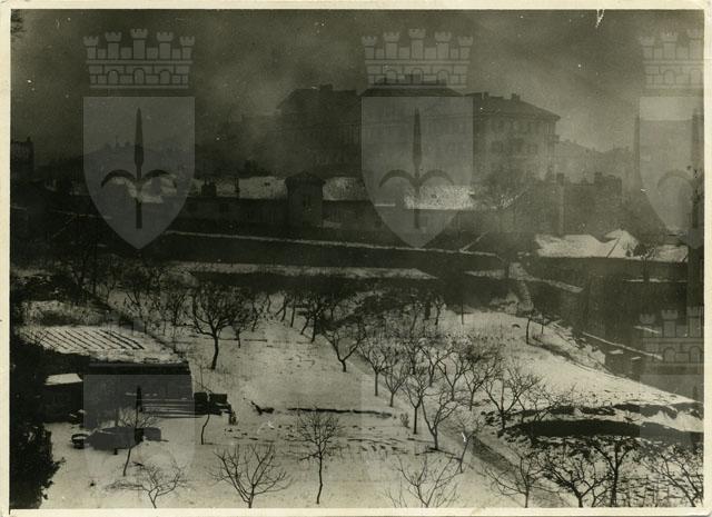Veduta dell'area archeologica antistante al Museo civico di Storia e Arte di Trieste innevata. La fotografia è stata scattata durante l'inverno a cavallo tra il 1946 e il 1947.