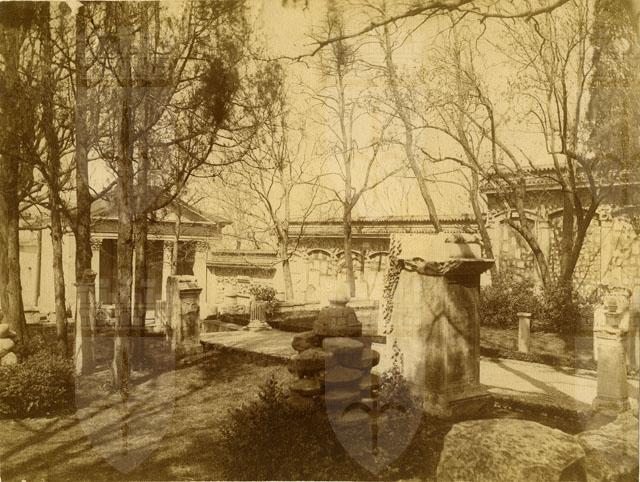 Veduta del terzo ripiano dell'Orto Lapidario dei Musei civici di Storia ed Arte di Trieste. In primo piano il camminamento tra le lapidi che attraversa il Lapidario e sullo sfondo il muro di cinta ad archi ciechi con le iscrizioni murate e il tempietto neoclassico che ospita il cenotafio di J.J. Winckelmann.