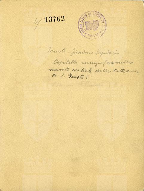 Capitello reimpiegato nella navata centrale della Cattedrale di San Giusto. All'epoca della foto, scattata tra la fine dell'Ottocento e la prima metà del Novecento, il pezzo era conservato presso l'Orto Lapidario del Museo civico di Storia ed Arte.