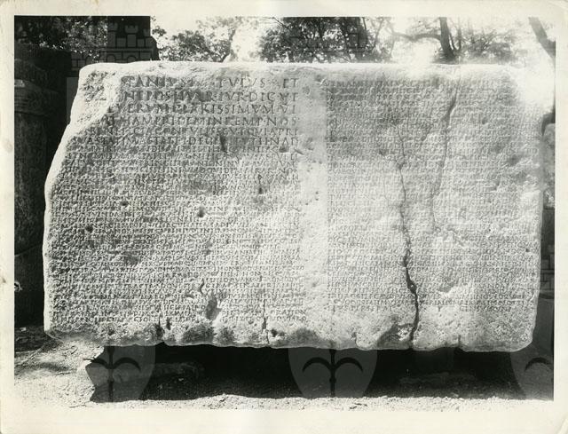 Basamento di statua equestre con iscrizione. Il pezzo è stato rinvenuto murato nelle mura medievali nei pressi della porta di San Lorenzo a Trieste, è stato successivamente portato nel 1539 nell'odierna piazza Unità d'Italia per essere esposto come antichità ed è attualmente conservato presso l'Orto Lapidario del Museo civico di Storia ed Arte. Sulla fronte reca l'iscrizione onoraria di Lucio Fabio Severo, un giovane senatore dell'epoca di Antonino Pio, mentre sul fianco, qui ritratto, è stato scolpito su due colonne il decreto approvato durante la seduta del consiglio municipale in cui si stabilirono e si giustificarono i riconoscimenti per il senatore. Il basamento si data al 138/161 d.C.