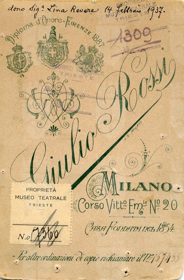 In costume di scena, probabilmente nel ruolo di Maddalena nell'"Andrea Chenier". A Trieste ha cantato al teatro Verdi nel 1899 in "Andrea Chenier", "Boheme", "Saffo"e "La resurrezione di Lazzaro"; nel 1914 in"Don Pasquale"e "Traviata"; nel 1920 in "Lodoletta"; al Politeama Rossetti nel 1900 in "Mignon"; al teatro Fenice nel 1894 in "I pagliacci" e nel 1896 in "Mignon" e "La pupilla"
