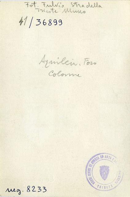 Colonne dell'area forense di Aquileia ricollocate in situ dall'anastilosi curata dall'architetto Ferdinando Forlati in seguito allo scavo condotto da Giovanni Battista Brusin nel 1934. Le colonne, di cui sono visibili in foto i tre esemplari posti in corrispondenza dell'area sudorientale del complesso, reggevano il porticato che circondava la piazza sui due lati lunghi e su quello meridionale. Presentano un fusto rudentato e capitelli compositi caratterizzati da due ordini di foglie d'acanto sormontati da una cornice a perle e astragali sulla quale aggettano quattro volute.