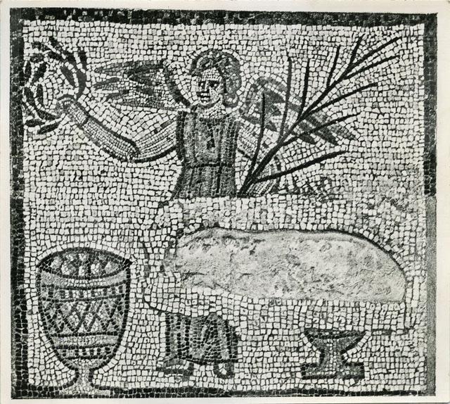 Particolare del mosaico che orna l'aula sud della Basilica teodoriana di Aquileia. Il dettaglio si riferisce al pannello musivo posto al centro dell'aula, in prossimità del noto tessellato con la vicenda del profeta Giona, caratterizzato da una composizione ortogonale di ottagoni e di rettangoli adiacenti, formanti piccoli ottagoni irregolari. Lo schema è interrotto al centro da un riquadro campito dalla raffigurazione di una Vittoria alata, visibile nella fotografia, che trattiene nelle mani una corona e un ramo di palma; ai suoi piedi vi sono un cesto colmo di pani e un altro recipiente che un restauro antico realizzato in tessere bianche non permette di identificare. Il pavimento si data al secondo decennio del IV sec. d.C.