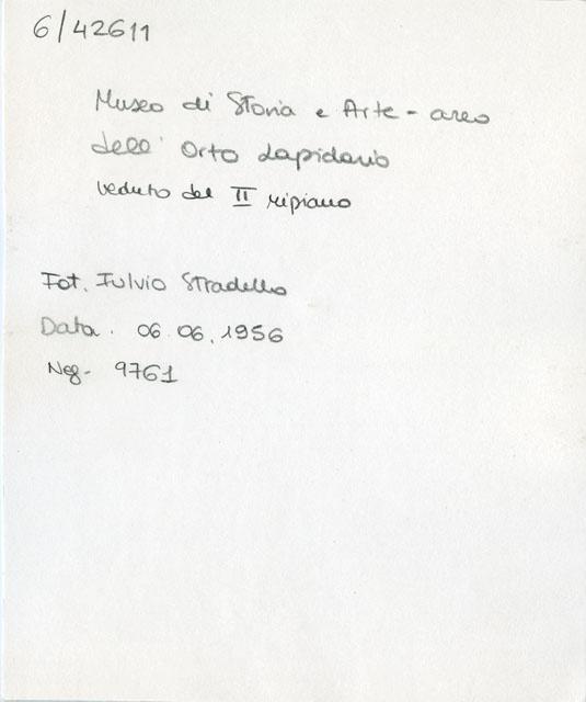 Veduta dei ripiani dell'Orto Lapidario del Museo di Storia ed Arte di Trieste con la chiesetta di San Michele al Carnale sullo sfondo.