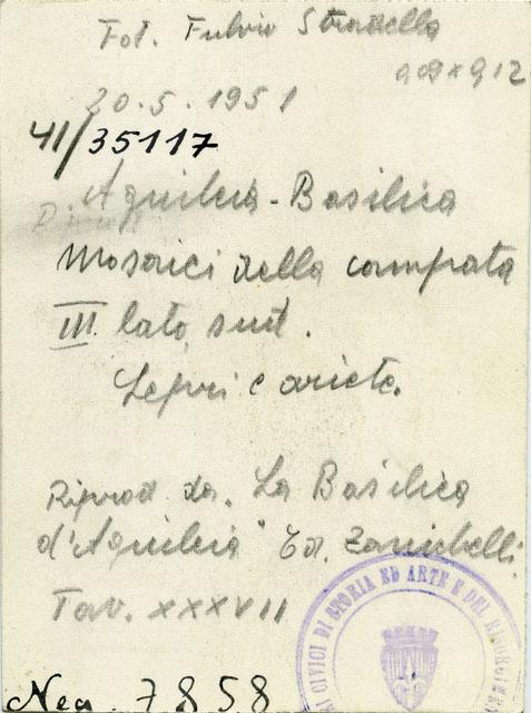 Particolari del pavimento musivo dell'Aula Sud della Basilica Teodoriana di Aquileia. I due dettagli appartengono al pannello posto a sud-est, decorato da una composizione reticolata di fusi e di cerchi tangenti (i cerchi nei punti di incrocio), formante ottagoni concavi irregolari. All'interno degli ottagoni vi sono quadrupedi orientati a nord; si distinguono due capri, due pecore, tre cavalli e una coppia di lepri. I cerchi, invece, sono campiti da volatili su racemi e quadrati a stuoia e i fusi da fioroni compositi longiformi di sei elementi non contigui (quattro foglie lanceolate e due loti trifidi). Il pavimento si data nella seconda metà del IV sec. d.C.