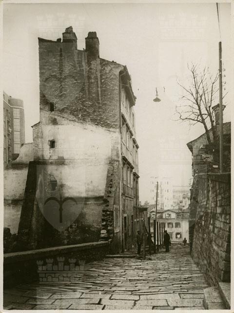 Demolizioni degli edifici collocati nell'area interessata dai resti del teatro romano, corrispondente alle zone di Riborgo e Donota in Cittavecchia. La foto riprende, in particolare, la posa dei pali per la demolizione dell'abitazione che insiste sull'area anticamente occupata dal muro perimetrale (tratto sud) della cavea del teatro.