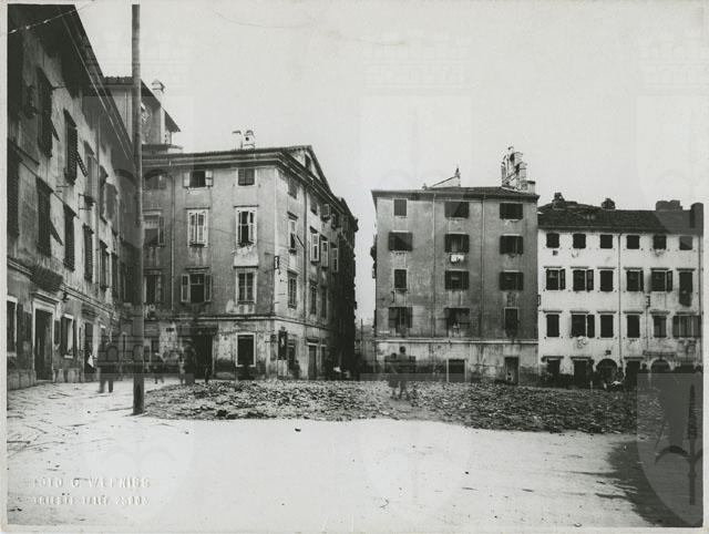 Via del Pozzo Bianco durante le demolizioni previste dal piano regolatore approvato durante il fascismo. La foto inquadra la casa nn. 343-342-341, l'androna Gusion e la casa nn. 120-121.