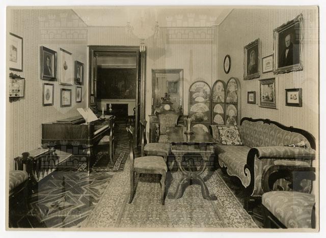 Mostra La casa dei nostri nonni : grande salone stile impero, camera da letto stile impero, anticamera, salottino di musica Biedermeier, salottino, salotto Biedermeier, camera da pranzo stile impero, salotto Biedermeier