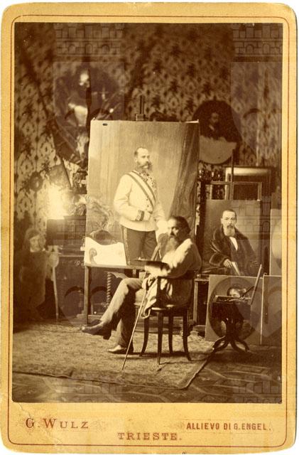 Nello studio: il ritratto di Francesco Giuseppe I e di Francesco Hermet del 1876; si riconosce anche il Nano Ostricaro realizzato intorno al 1842 ca. realizzato dal padre Giuseppe e conservato presso il Civico Museo Revoltella (Museo Revoltella : la Galleria d'arte moderna : la guida. Trieste : Civico museo Revoltella, 2008, p. 60). /p