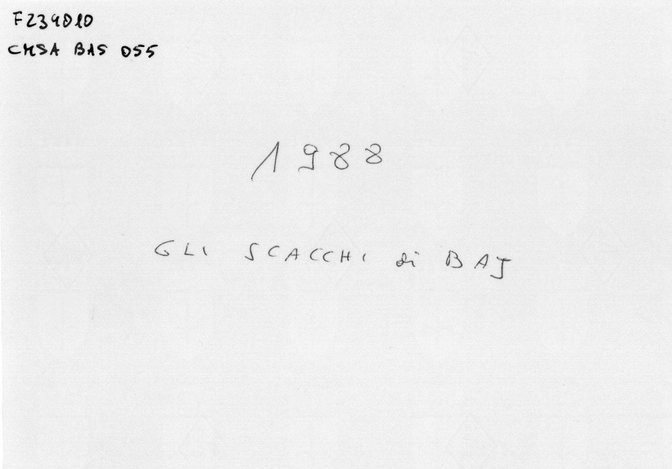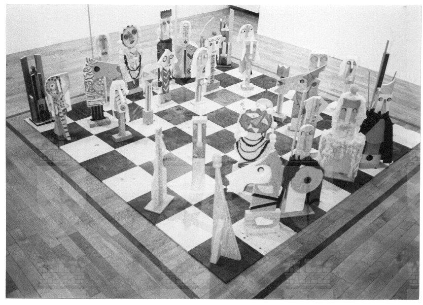 Gli Scacchi di Baj, realizzati nel 1988, sono un multiplo, ufficialmente con una tiratura di 30 esemplari (in realtà ne sono stati realizzati 15) + cinque contraddistinti da numeri romani da I a V. Dimensioni: altezza media dei pezzi cm 75; Scacchiera cm 272 x 272 composta da 64 caselle di cm 34 x 34; Pedana scacchiera cm 282 x 282 altezza cm 34.