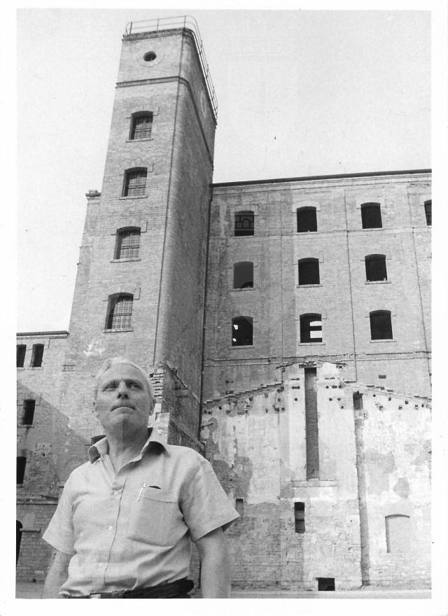 Mario Montanaro in cortile. Edificio centrale sullo sfondo
