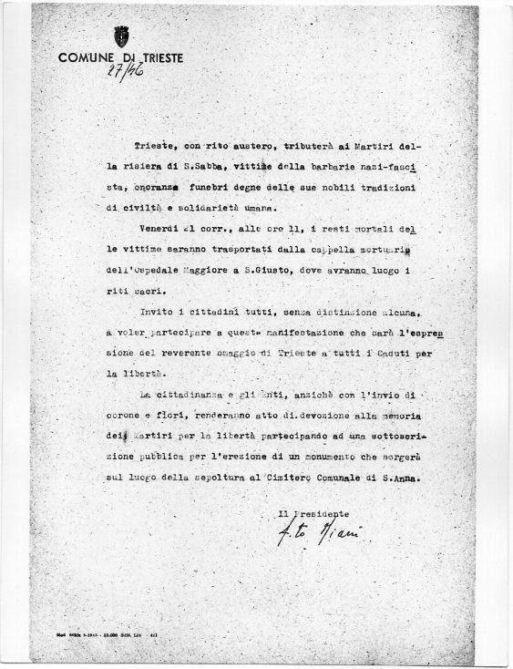 Delibera comunale per il tributo ai Martiri della Risiera di San Sabba, vittime delle barbarie nazi-fasciste