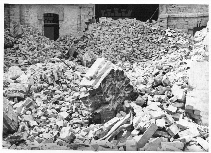 In primo piano macerie del forno crematorio, sullo sfondo un altro edificio rimasto danneggiato dallo scoppio