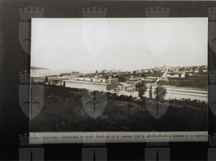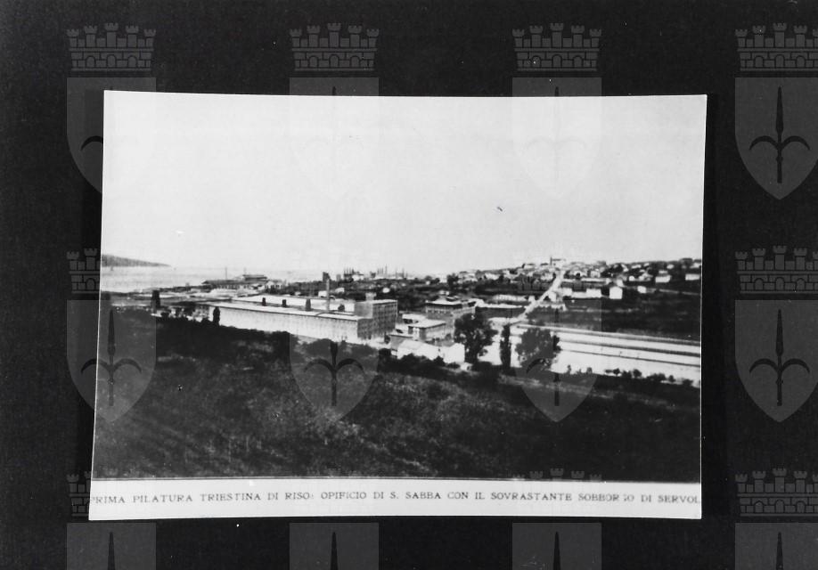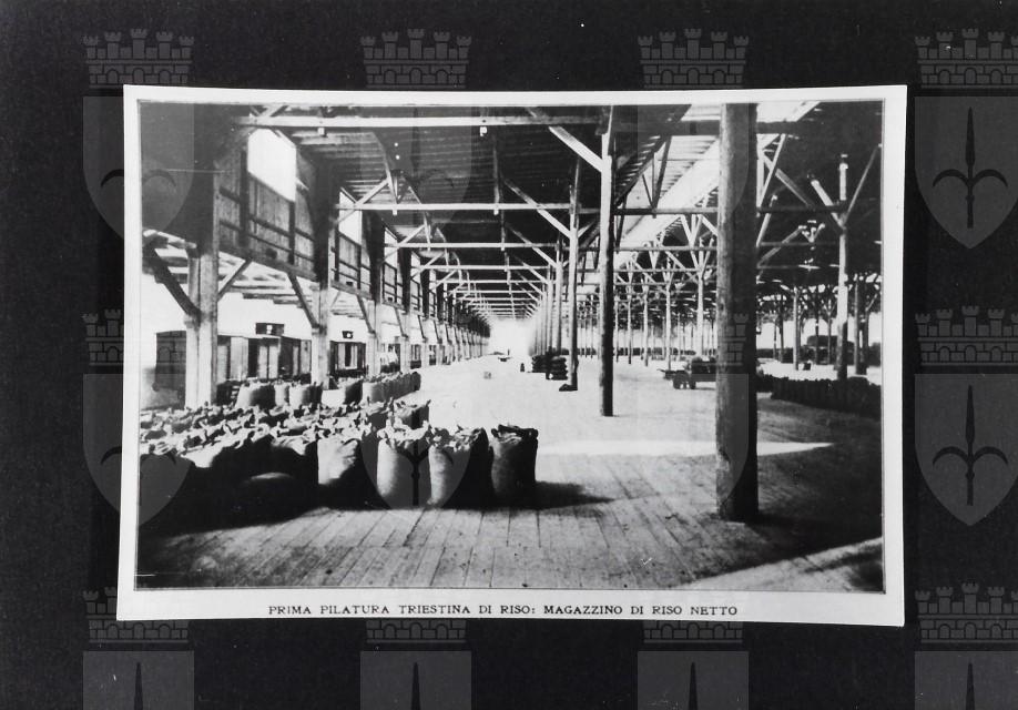 Riproduzione fotografica degli edifici della pilatura del riso, dei magazzini