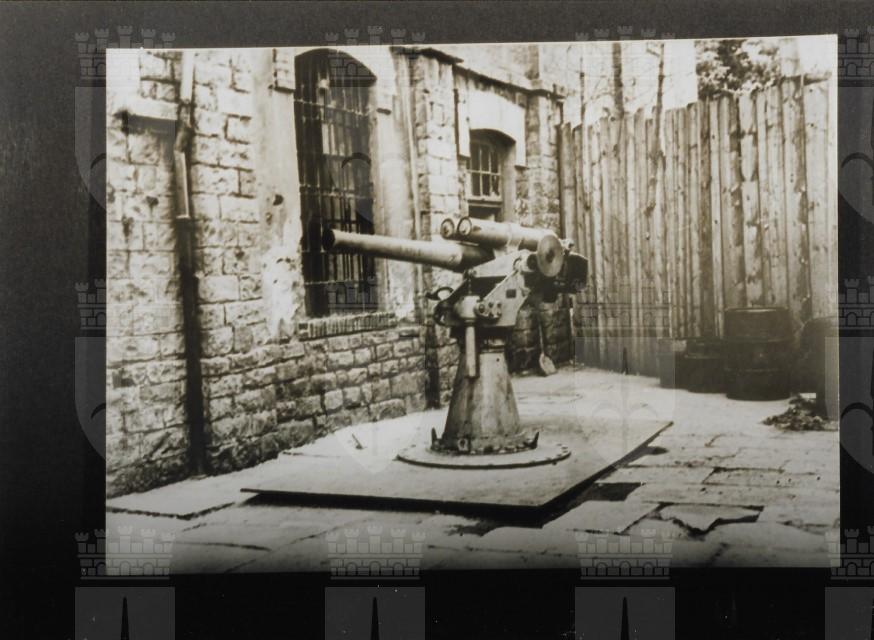 Riproduzione fotografica del cannone antiaereo tedesco nel cortile della Risiera