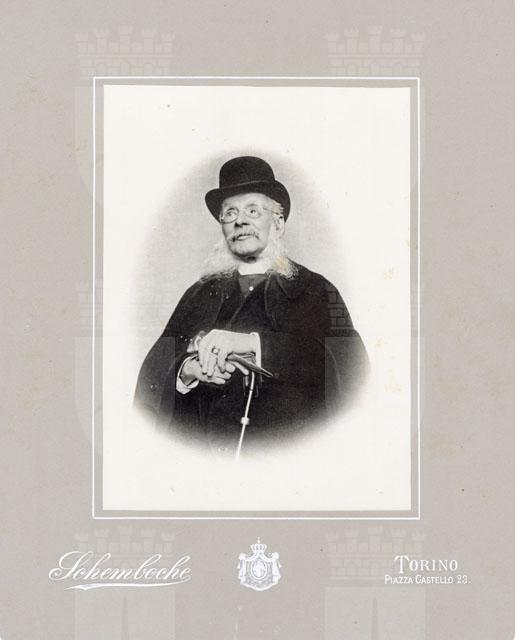 L'anziano barone è ripreso frontalmente con bastone, mantella e cappello a cilindro. Impugna un paio di guanti