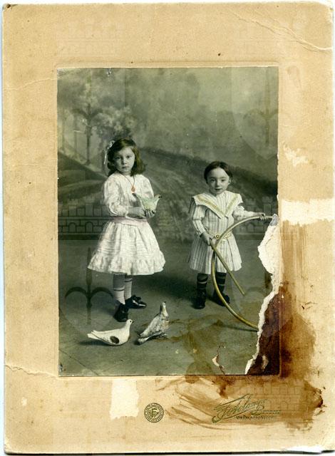 Bambini ritratti mentre giocano con un cerchio e dei piccioni