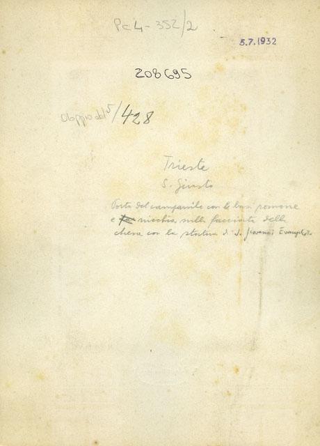Facciata del campanile con le basi di monumenti romani e nicchia sulla facciata della chiesa con la statua in legno di san Giovanni evangelista