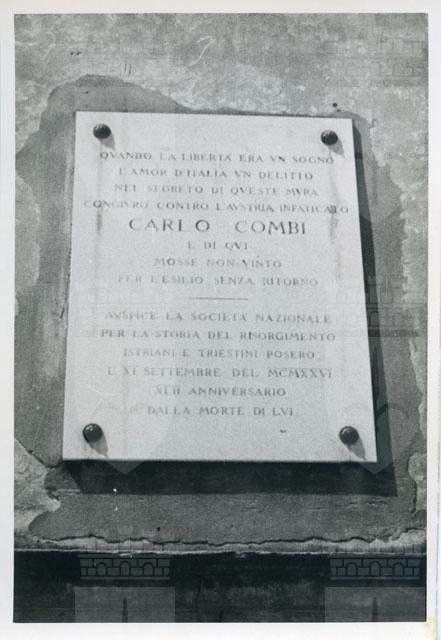 Carlo Combi (Capodistria, 27 luglio 1847-Venezia, 11 settembre 1884) Sulla lapide la scritta: QUANDO LA LIBERTA' ERA UN SOGNO/ L'AMOR D'ITALIA UN DELITTO/ NEL SEGRETO DI QUESTE MURA/ CONGIURO' CONTRO L'AUSTRIA/ CARLO COMBI E DI QUI/ MOSSE NON VINTO/ PER L'ESILIO SENZA RITORNO/ AUSPICE LA SOCIETA' NAZIONALE/ PER LA STORIA DEL RISORGIMENTO/ ISTRIANI E TRIESTINI POSERO/ L'XI SETTEMBRE DEL MCMXXVI/ XLII ANNIVERSARIO/ DALLA MORTE DI LUI