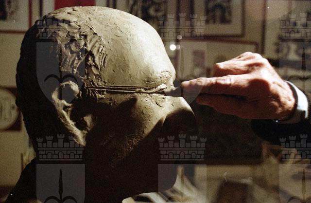 Ugo Carà scultore al lavoro, scultura Pacorini padre, Donaggio.