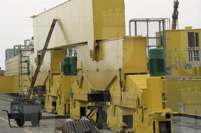 Molo VII, gru posa in opera, operai, lavoro, ferrovia, treno, container, saldatore.