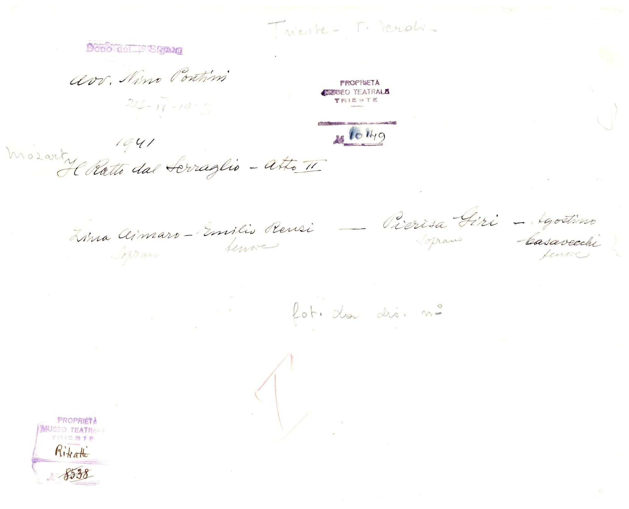 Il ratto dal serraglio, Lina Aimaro, Emilio Renzi, Pierisa Giri e Agostino Casavecchi. Teatro Verdi, Trieste, 1941