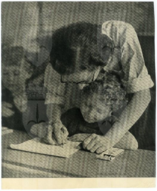 Nell'esemplare dell'Imperial War Museum si specifica che i bambini provengono da Polonia, Cecoslovacchia, Ungheria mentre la maestra è Irene Mandel, un'insegnante di scuola ceca, già internata nel campo. La maestra parla cinque lingue ma insegna in tedesco, l'unica lingua che i bambini comprendono.