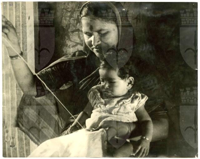 Ritratto di lavoratrice tessile hindu fotografata nell'atto di tessere una tenda mentre tiene il figlio in braccio