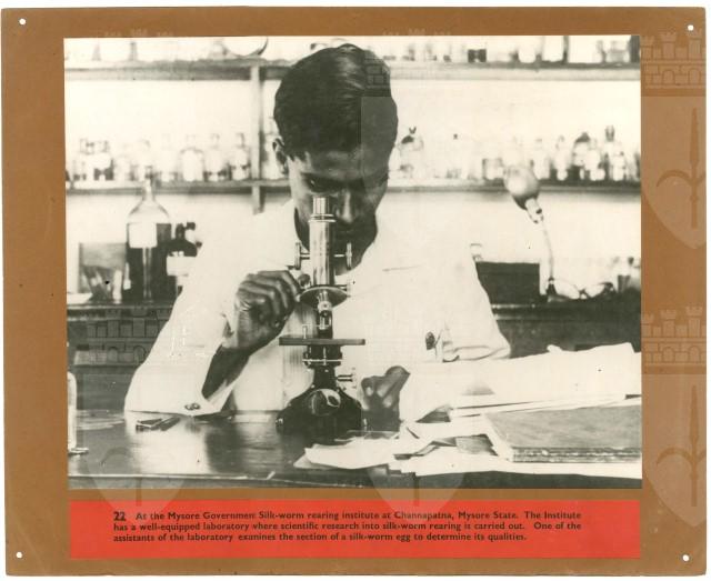 HomeAt the Mysore Government Silk worm rearing institute at Channapatna, Mysore State. The Institute has a well equipped laboratory where scientific research into silk worm rearing is carried out. One of the assistants of the laboratory examines the section of a silk worm egg to determine its qualities