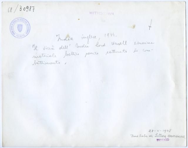 Wavell, Archibald Percival, visconte di Winchester e di Cirenaica, lord. - Generale (Colchester 1883 - Londra 1950). Partecipò alla guerra contro i Boeri (1899-1902) e alla prima guerra mondiale, servendo poi in Egitto con il gen. E. H. H. Allenby e nel corpo di occupazione sul Reno (1919-20). Richiamato al War Office e inviato più tardi in Rhodesia del Sud, nel 1939 fu nominato comandante in capo delle forze britanniche nel Medio Oriente. In tale veste diresse le operazioni contro gli Italiani in Cirenaica (dic. 1940 - genn. 1941) e in AOI (genn.-maggio 1941) costringendoli alla ritirata; ma non riuscì ad arrestare l'invasione tedesca della Grecia e di Creta, né a fermare le truppe di Rommel in Nord Africa. Trasferito (luglio 1941) al comando in capo delle forze britanniche delle Indie, dovette indietreggiare di fronte all'avanzata giapponese in Malesia, Singapore e Burma. Lasciato il comando nel giugno 1943, fu promosso maresciallo di campo e nominato vicerè dell'India, carica che mantenne fino al 1947. Notizia desunta da: http://www.treccani.it/enciclopedia/wavell-archibald-percival-visconte-di-winchester-e-di-cirenaica-lord