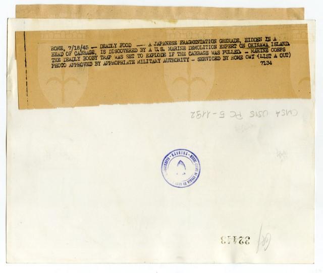 Un marinaio americano di istanza sull'isola di Okinawa mostra una granata giapponese nascosta all'interno di una pianta di cavolo.