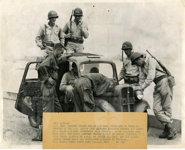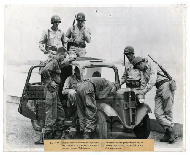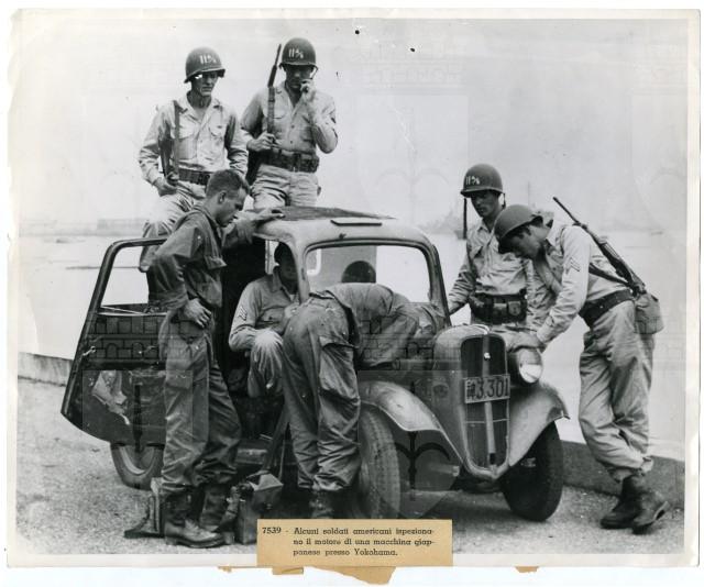 Una truppa americana dell'undicesima divisione aerea ispeziona il motore di un'automobile giappponese nella città di portuale di Yokohama, invasa il 29 agosto 1945.